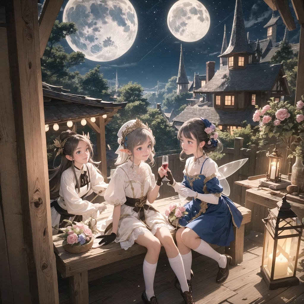 On International Fairy Day, a grand event is taking place in the magical world of fairies, captured in an overhead view. The scene is set under a clear, starry night with a full moon casting a mystical glow. The air is crystal clear, enhancing the magical atmosphere.