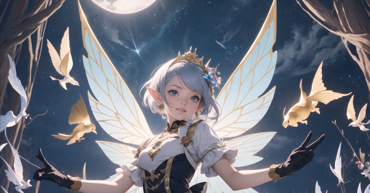 月明かりが優しく街を照らす夜、妖精たちは年に一度の「国際妖精デー」のために集っていた。夜空には二つの月が輝き、その光が妖精たちの羽を照らし、銀色の光が街中に反射して舞い上がる。この日は特別な儀式の日で、長年続く伝統を祝い、妖精の絆を深めるための時間。祭りの準備を進めながら、彼女たちは集う仲間と共に喜びと期待に満ちた笑顔を交わす。